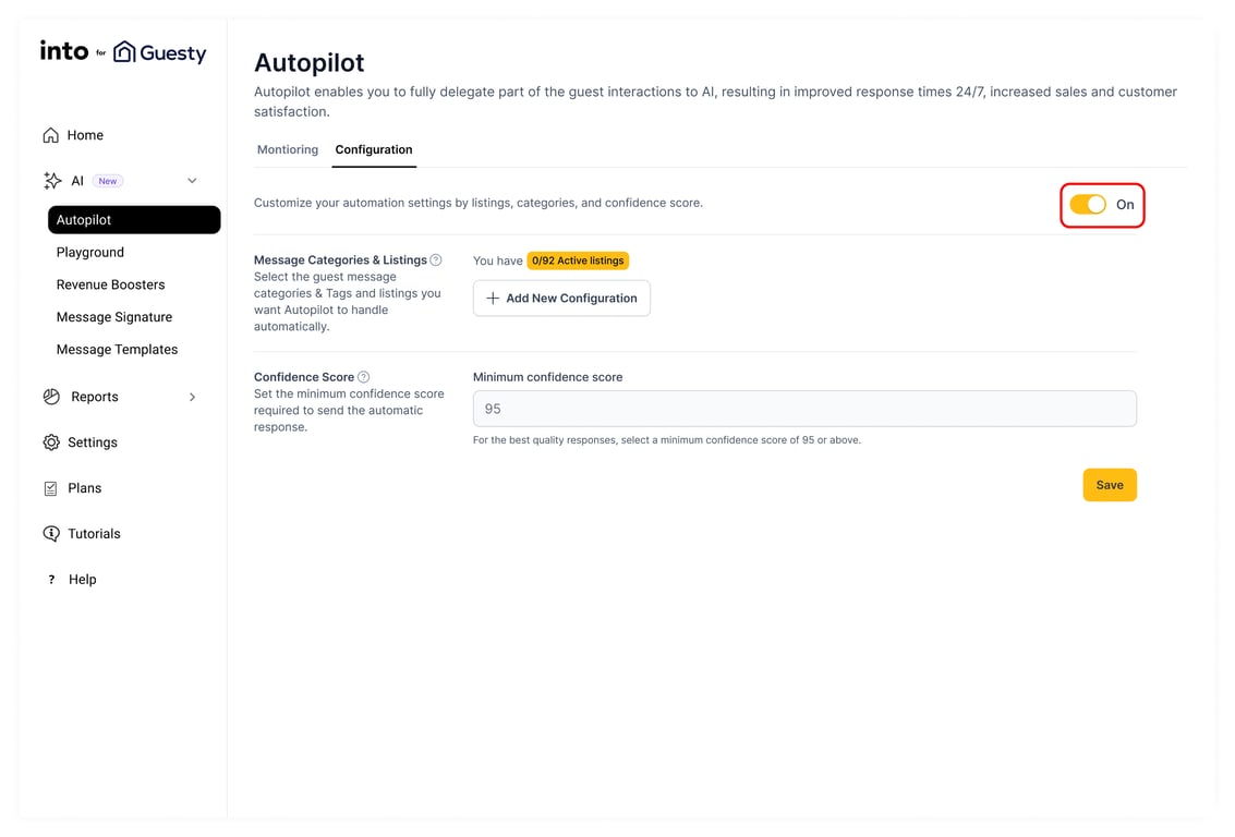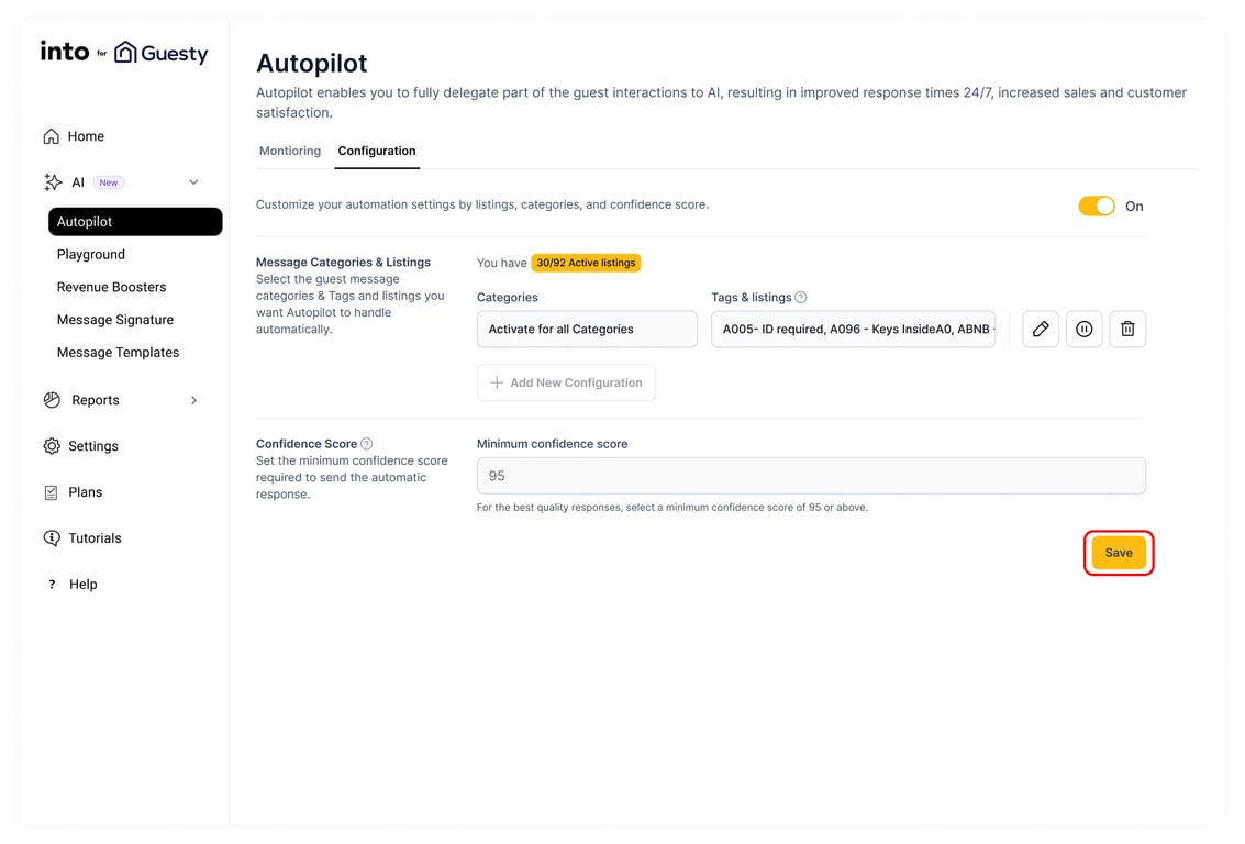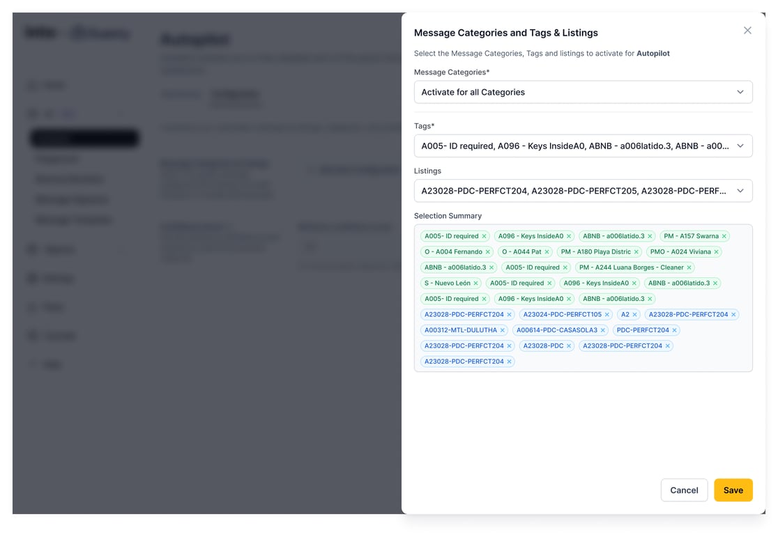 To configure Autopilot, log in to your account at https://str.weareinto.ai and navigate to AI > Autopilot > Configuration. Toggle the switch to activate Autopilot. You can choose to enable it for all listings or select specific ones. Next, define the categories for which you’d like Autopilot to send responses. Once you're satisfied with your settings, click Save. Please note that while we currently offer a few categories for Autopilot mode, more will be added in the coming weeks.