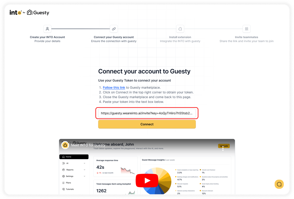 After creating your account, follow these simple steps to connect your INTO account with your Guesty account. First, click the link provided to access the Guesty marketplace. In the marketplace, click "Connect" in the top right corner to obtain your Guesty token. Once you have copied the token, close the Guesty marketplace and return to the INTO page. Paste your Guesty token into the message box and click "Connect my account to Guesty."