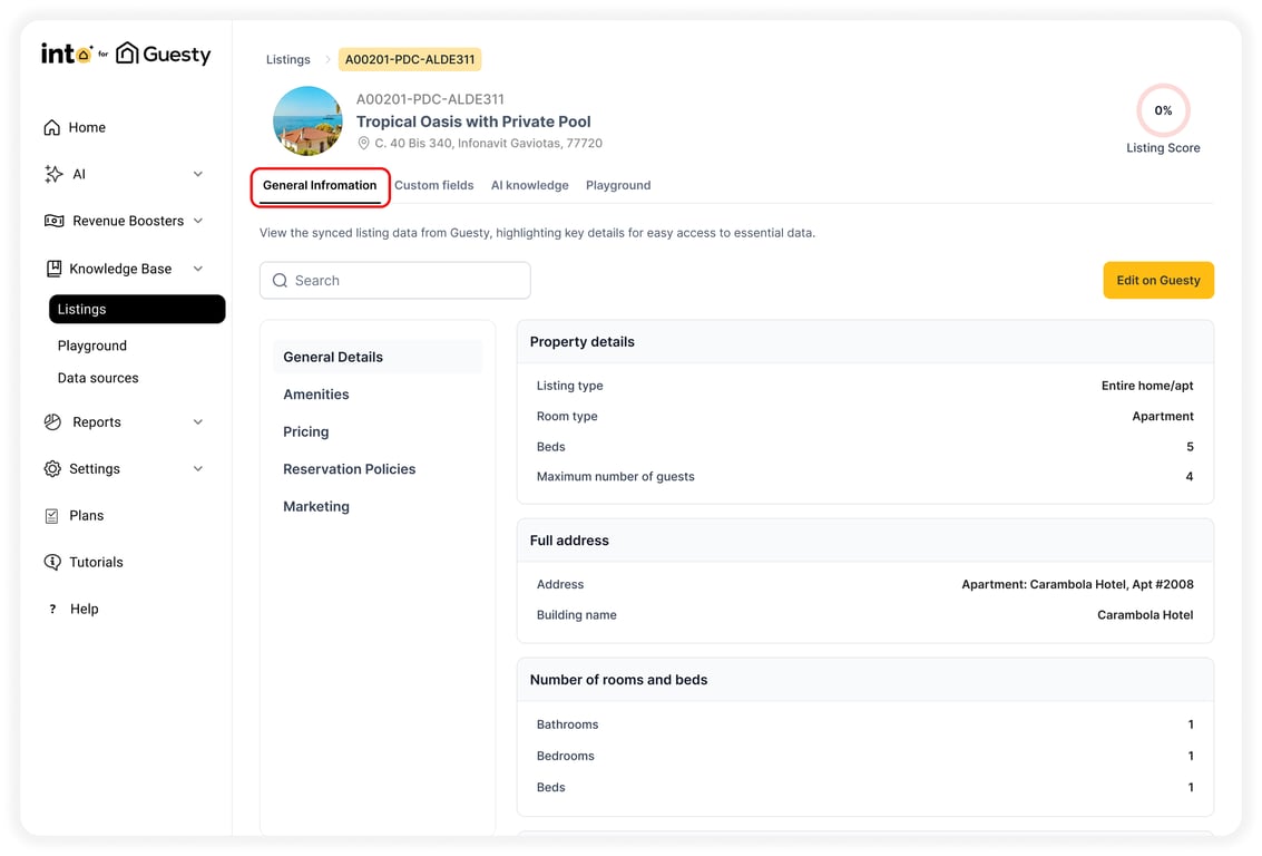 Each listing starts with information synced from Guesty. This includes: