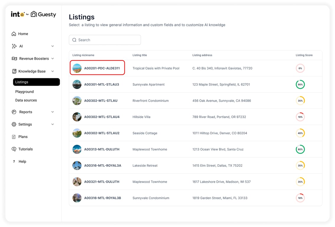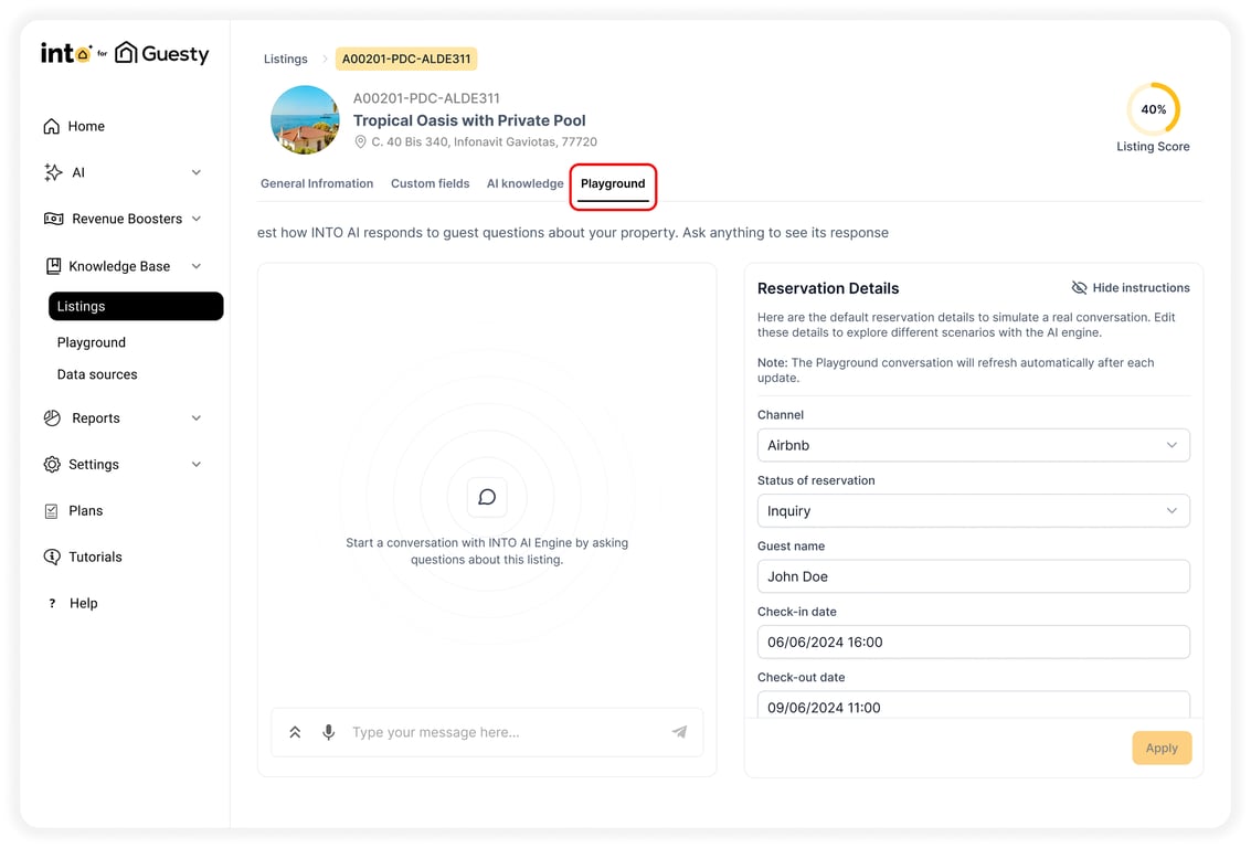 Once your listing’s Knowledge Base is filled in, you can simulate guest interactions using the Playground tab.