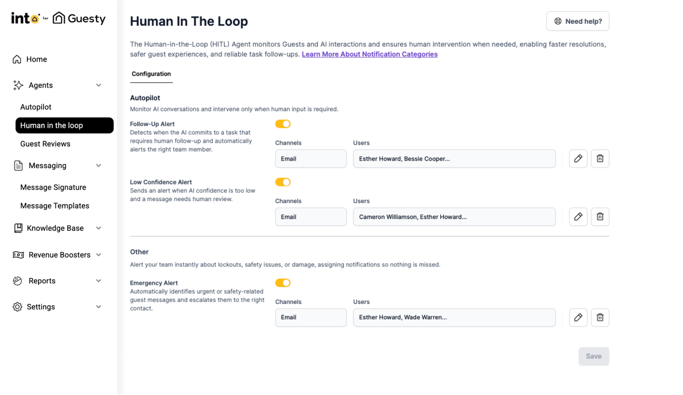 While your Autopilot handles routine guest messages, the HITL continuously monitors ongoing chats, detects when intervention might be required, and enables your team to jump in instantly, ensuring faster resolutions for complex or sensitive requests, Safer and more personalized guest experiences and reliable follow-ups for pending or missed actions