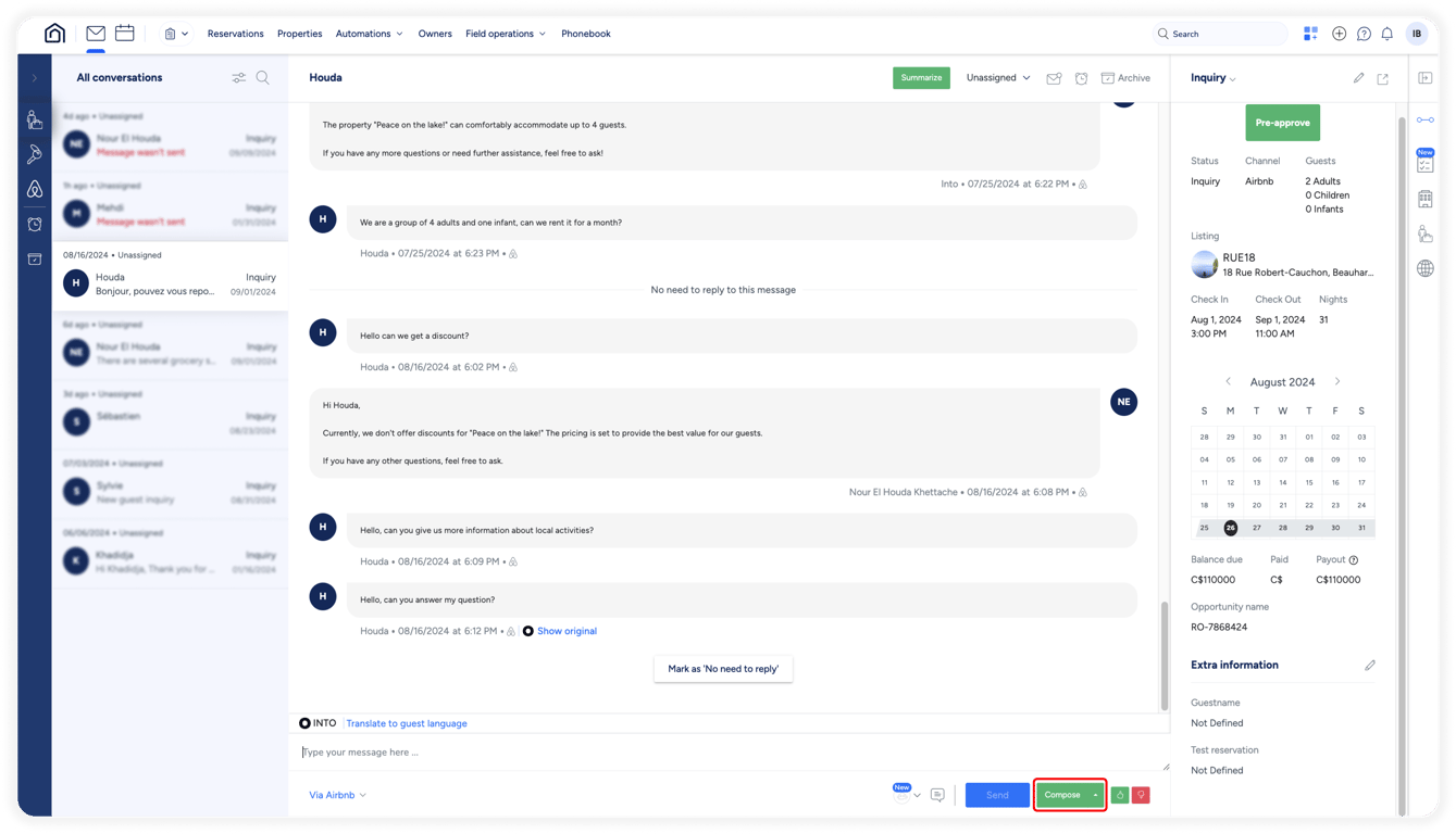Let’s begin with Suggest Mode: When you receive a guest message in your Guesty inbox, leave the text box empty and click the Compose button. INTO AI will instantly generate a tailored response in the guest's preferred language, drawing on your INTO knowledge base. This includes detailed listing information, saved replies, custom fields, enriched data, reservation details, and conversation history. Once the AI-generated response is ready, you can review it, make any necessary edits, and hit 'Send'—it's that simple!